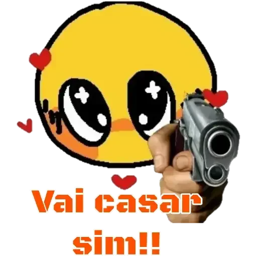Um emoji amarelo com olhos grandes e sonhadores, uma mão segurando uma arma apontando para ele, com texto 'Vai casar sim!!' e corações vermelhos.
