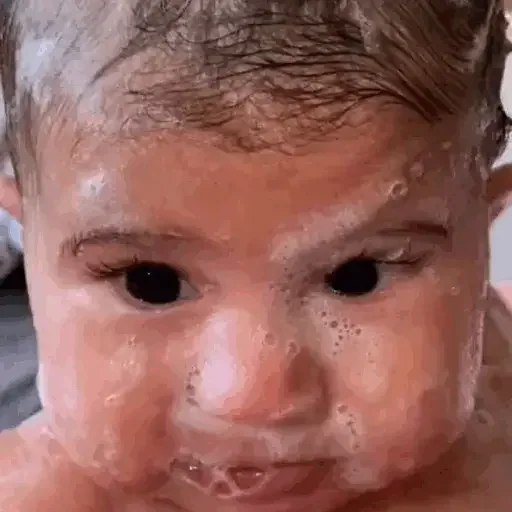 Rosto de bebê com espuma de sabão nos cabelos e na pele, olhando para frente com expressão neutra.