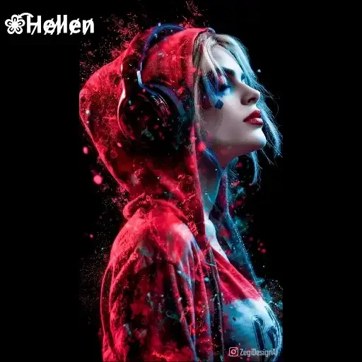 Uma mulher com headphones e capuz, com efeito de iluminação em vermelho e azul, contra um fundo preto. O nome '@ Hellen' aparece no canto superior esquerdo.