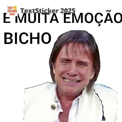 Um homem com cabelo castanho e um sorriso, vestindo uma jaqueta branca. A imagem tem o texto 'É MUITA EMOÇÃO BICHO' em letras pretas.