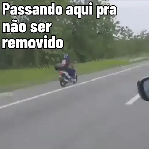 Um motociclista passando em uma estrada com a frase 'Passando aqui pra não ser removido' sobreposta.