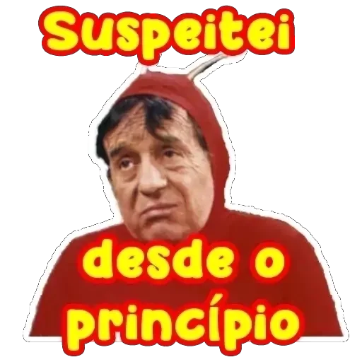 Homem com expressão séria e desconfiante, vestindo uma blusa vermelha com capuz, com o texto 'Suspeitei desde o princípio' em letras amarelas com contorno vermelho.