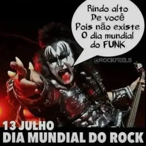 Um homem com maquiagem branca e preta no rosto, vestindo uma roupa de couro preto e vermelho, com um violão, falando em uma bolha de fala 'Rindo alto de você pois não existe o dia mundial do FUNK'. Abaixo dele, está escrito '13 JULHO DIA MUNDIAL DO ROCK'.