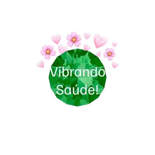 Um círculo verde brilhante com a frase 'Vibrando Saúde!' em branco, rodeado de flores e corações rosa.