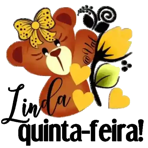 Um ursinho marrom com uma flor amarela no cabelo e texto 'Linda quinta-feira!'