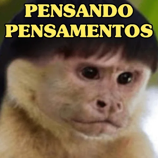 Macaco com expressão pensativa e cabelo preto, com o texto 'PENSANDO PENSAMENTOS' em amarelo.