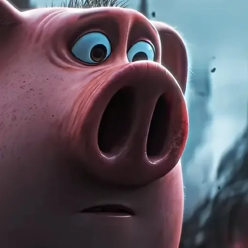 Rosto de um porco rosa com olhos azuis e expressão de surpresa ou susto, com a boca aberta.