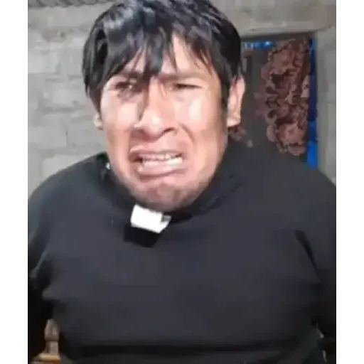 Um homem com franja preta e um colarinho branco sorri com a boca aberta, vestindo uma camisa preta. Ele parece um padre ou um personagem cômico.