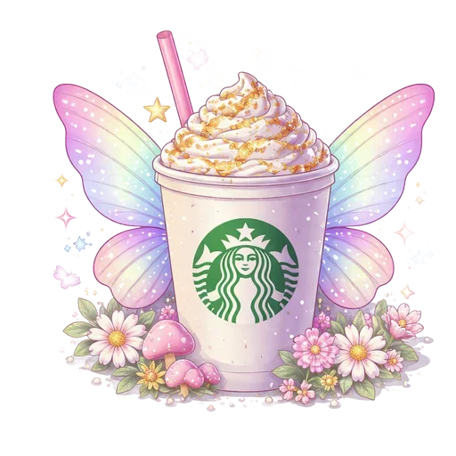Um copo de Starbucks com uma tampa de espuma colorida e um canudo rosa, decorado com asas de borboleta arco-íris e flores.