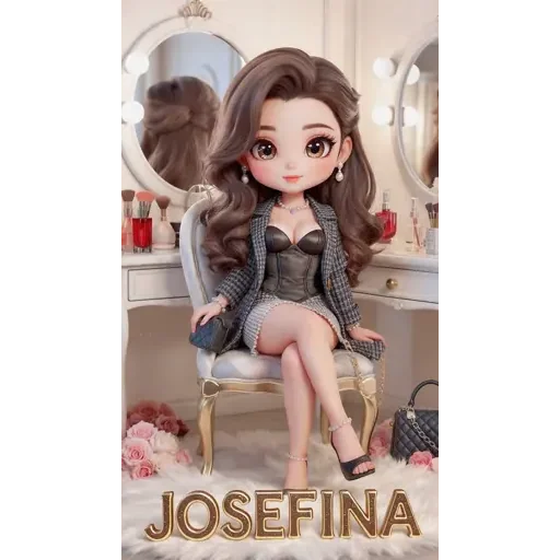 Uma boneca de anime sentada em uma cadeira diante de um espelho, vestindo um conjunto cinza. Ela tem cabelo castanho longo e o nome 'JOSEFINA' está escrito abaixo dela.