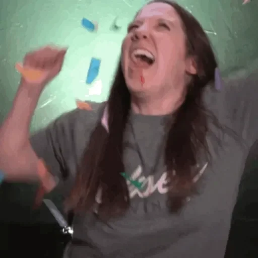 Homem com cabelo longo e camiseta cinza, com expressão de alegria e braço levantado, em um fundo verde com confetes.