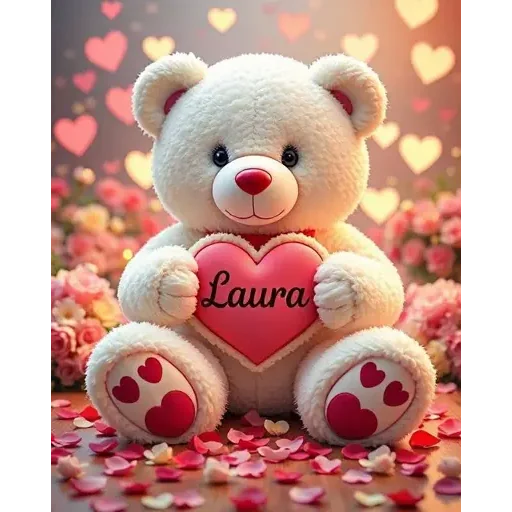 Um ursinho de pelúcia branco com coração rosa e o nome 'Laura' em letras pretas cursivas, em meio a flores e corações.