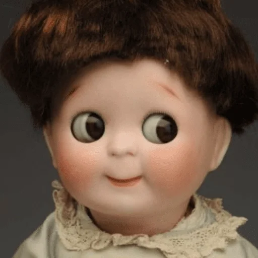 Rosto de uma boneca antiga com olhos grandes e arregalados, cabelo castanho escuro e uma expressão levemente sorridente. Ela usa uma roupa com colarinho rendado.