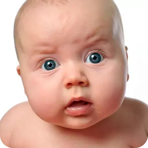 Bebê com expressão de surpresa, olhos azuis arregalados e boca ligeiramente aberta.