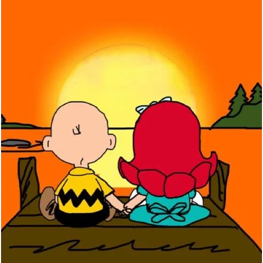 Charlie Brown e Lucy sentados em um cais, de costas, assistindo ao pôr do sol. Charlie Brown veste uma camisa amarela com listras pretas e Lucy tem cabelos vermelhos e uma blusa azul.