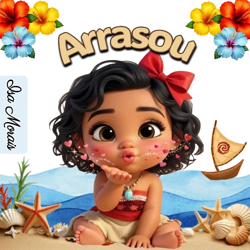 Uma menina com cabelo castanho e um laço vermelho no cabelo, sentada na praia com estrelas-do-mar e conchas, fazendo um gesto de beijo. Ela tem uma expressão fofa e coraçõezinhos no rosto. A palavra 'Arrasou' está escrita acima dela.