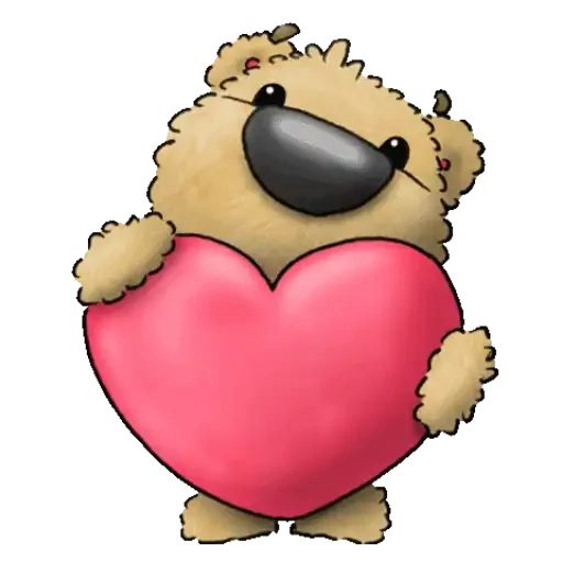 Um ursinho de pelúcia com olhos fechados e um focinho preto grande está abraçando um coração vermelho grande.