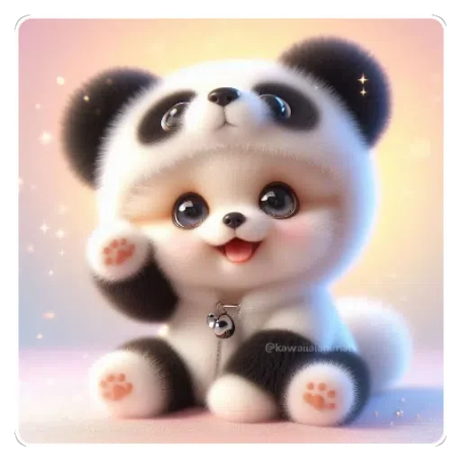 Um ursinho panda fofinho com olhos grandes e orelhas redondas, fazendo um gesto com a pata. Fundo colorido com tons de rosa e amarelo.