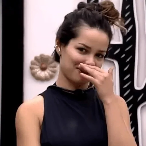 Mulher com cabelo castanho e vestido preto cobrindo a boca com a mão, parecendo surpresa ou chocada.