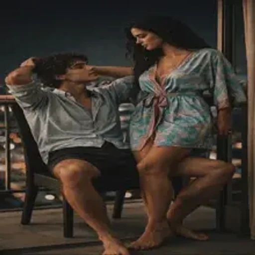 Um casal em um ambiente noturno, com a mulher tocando o cabelo do homem, que está sentado e parece relaxado.