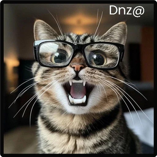 Gato com óculos de armação preta, olhos arregalados e boca aberta mostrando os dentes. O gato tem um fundo desfocado ao fundo e a legenda 'Dnz@' no canto superior direito.