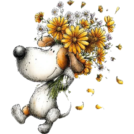 Um cachorro branco com orelhas castanhas dançando com um buquê de flores amarelas e verdes na cabeça.