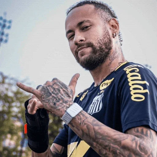Homem com camisa preta e amarela fazendo um gesto com as mãos, com pulseira branca no pulso e tatuagens nos braços.