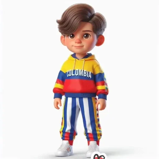 Menino de cabelo castanho com um moletinho, vestindo uma blusa de manga longa nas cores amarelo, vermelho, azul e branco com a palavra Columbia, e calças listradas em branco e azul com detalhes em vermelho e amarelo.