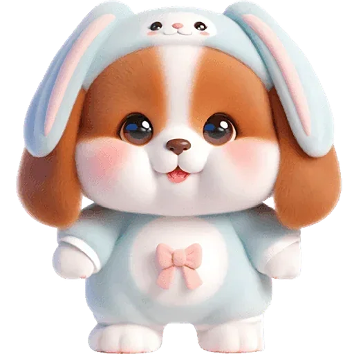 Um cachorro fofinho vestido com um macacão azul claro com um laço rosa e uma touca de coelho azul com orelhas compridas.
