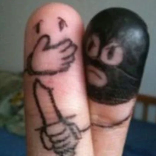 Dedos desenhados com expressões engraçadas, um com a mão na boca e o outro com máscara preta e olhos arregalados.