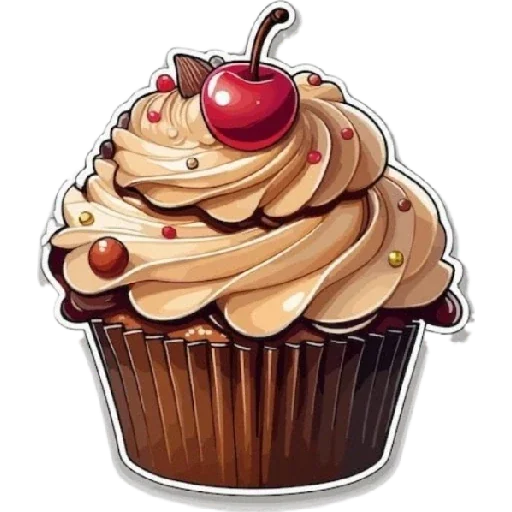 Um cupcake de chocolate com cobertura de creme e uma cereja vermelha no topo, decorado com confeitos coloridos.