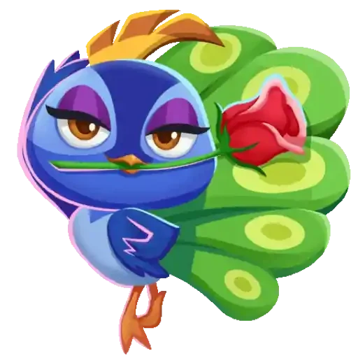 Um pássaro azul cartoon com penas verdes e uma rosa vermelha na cauda, com expressão facial zangada e cílios postiços.