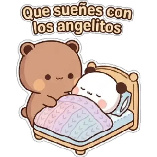 Um ursinho marrom ao lado de um ursinho branco que está deitado na cama, com a frase 'Que sueñes con los angelitos' acima.