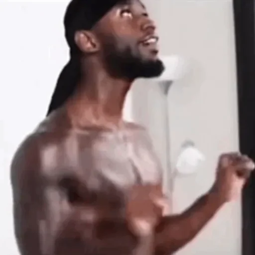 Homem negro com cabelo preto preso em um rabo de cavalo, sem camisa, com expressão de raiva ou frustração, socando uma superfície.