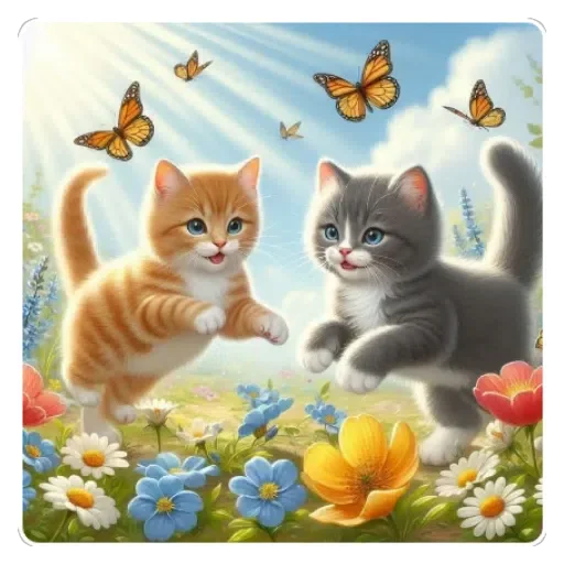 Dois gatinhos, um laranja e um cinza, estão correndo em um campo de flores coloridas sob um céu azul com borboletas laranjas.
