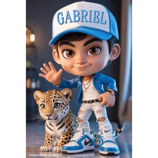 Menino de desenho animado com um boné azul e branco que diz 'GABRIEL', ao lado de um filhote de onça-pintada. Ele está com uma mão levantada e vestindo roupas brancas e azuis.