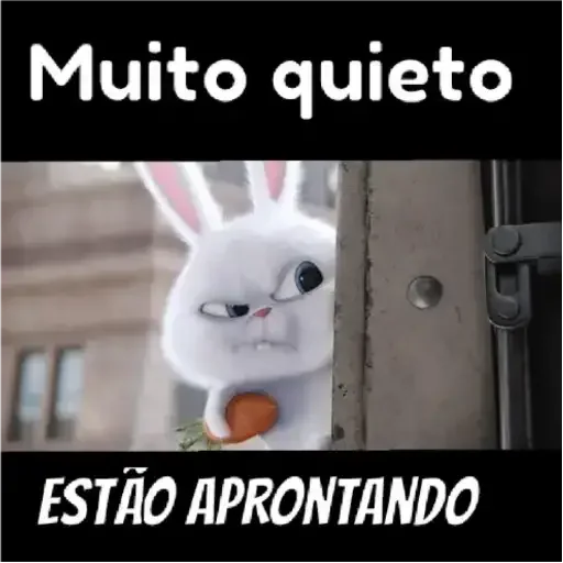 Um coelho branco com orelhas rosadas e expressão séria, olhando por uma porta entreaberta. A imagem tem faixas pretas com textos 'Muito quieto' e 'ESTÃO APRONTANDO'.