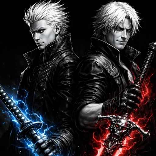 Duas versões de um personagem com cabelos brancos e jaqueta preta, cada um com uma espada, uma com chamas azuis e a outra com chamas vermelhas.
