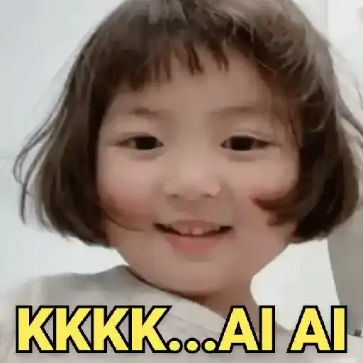 Menina com franja e cabelo curto sorrindo, com texto 'KKKK...AI AI' em amarelo.