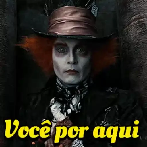 Um homem com maquiagem pálida e chapéu rosa, parecendo o Chapeleiro Maluco, com o texto 'Você por aqui' em amarelo na parte inferior.