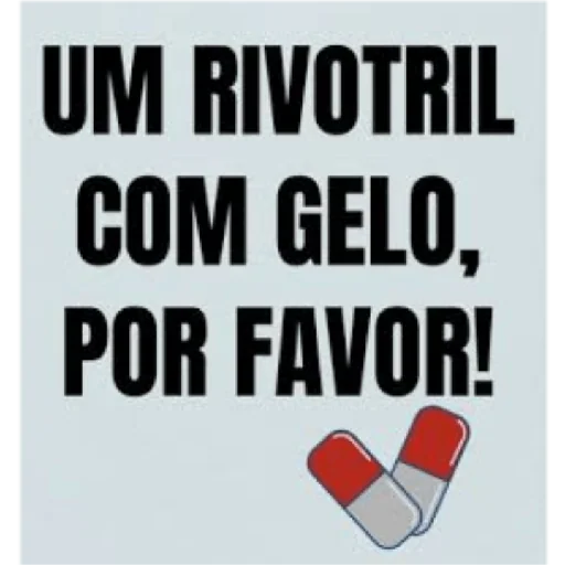 Um texto em preto sobre fundo claro que diz 'UM RIVOTRIL COM GELO, POR FAVOR!' com duas cápsulas de medicamento ilustradas abaixo.