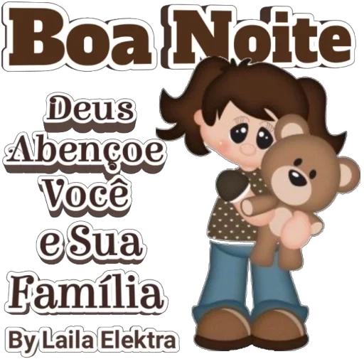 Uma menina de cabelos castanhos abraçando um ursinho de pelúcia, com o texto 'Boa Noite Deus Abençoe Você e Sua Família By Laila Elektra'.