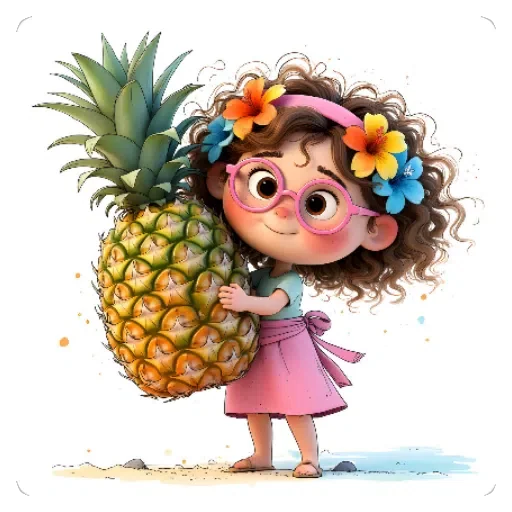 Menina de cabelos castanhos e cacheados, com flores coloridas na cabeça e óculos de sol, segura um abacaxi gigante com um sorriso no rosto.