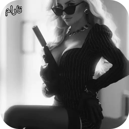 Mulher de óculos de sol e roupa preta segurando uma arma, com texto 'ابلیس' no canto superior esquerdo.