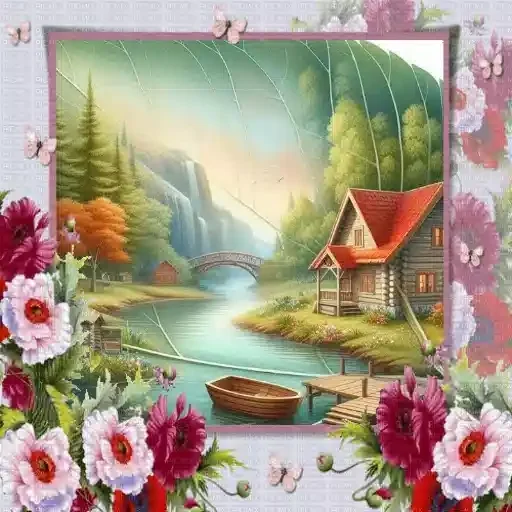 Uma paisagem serena com uma casa de madeira e telhado vermelho à beira de um lago, rodeada por montanhas, árvores e flores coloridas.