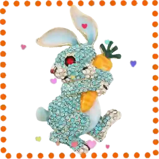 Um coelho azul decorado com pedras brilhantes, segurando uma cenoura laranja, com orelhas grandes e coração rosa no fundo.