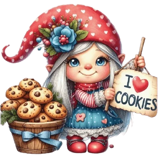 Uma menina fofa com chapéu vermelho e branco, segurando um cartaz que diz 'I ♥ COOKIES' e ao lado uma cesta de biscoitos.