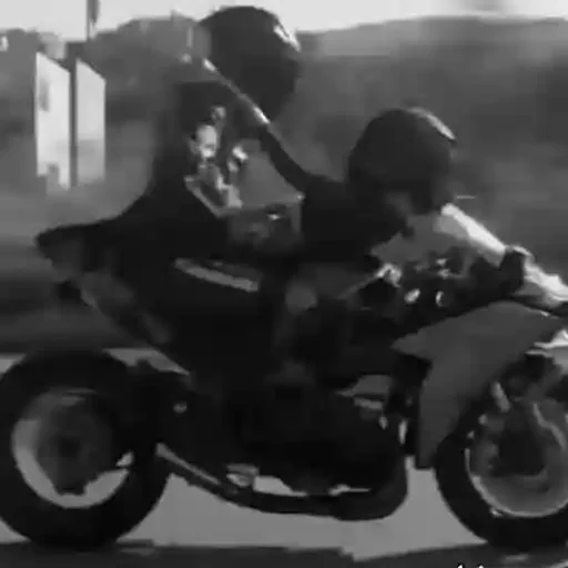 Um casal em uma motocicleta, com o passageiro fazendo um gesto com a mão.