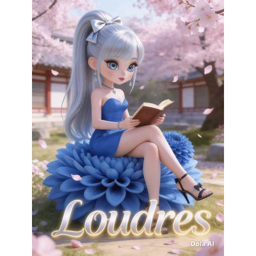Uma garota de anime com cabelo cinza claro e olhos azuis sentada em uma flor azul, lendo um livro em um cenário com árvores de cerejeira em flor. Ela veste um vestido azul e sapatos de salto alto. A palavra 'Loudres' está escrita embaixo dela.