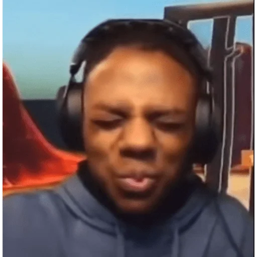 Homem negro com fones de ouvido, expressão facial relaxada e língua para fora.